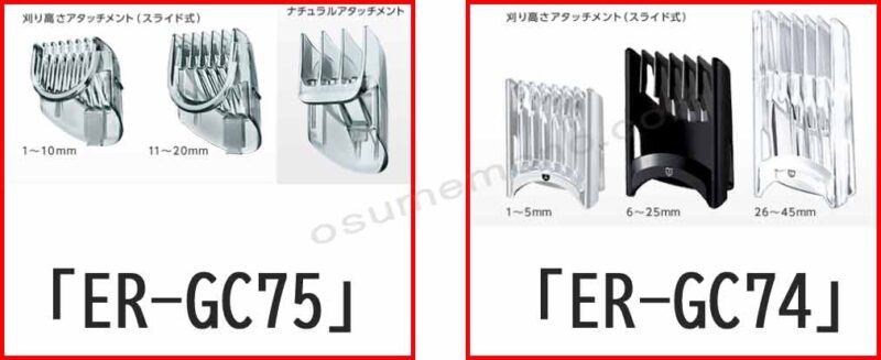 「ER-GC75」には2つの刈り高さアタッチメント+ナチュラルアタッチメントが付属し、「ER-GC74」には3つの刈り高さアタッチメントが付属します。