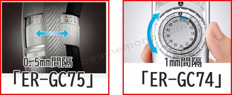 「ER-GC75」は0.5mm刻みで細かな調整が可能、「ER-GC74」は1mm間隔ですが45mmまでの長めのスタイル調整が可能です。