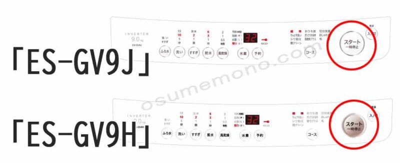 「ES-GV9J」はパネルデザインがわずかに変わりました。「ES-GV9H」はスタートボタン全体がブラウンだったのが、「ES-GV9J」はスタートボタンの縁のみブラウンカラーになりました。